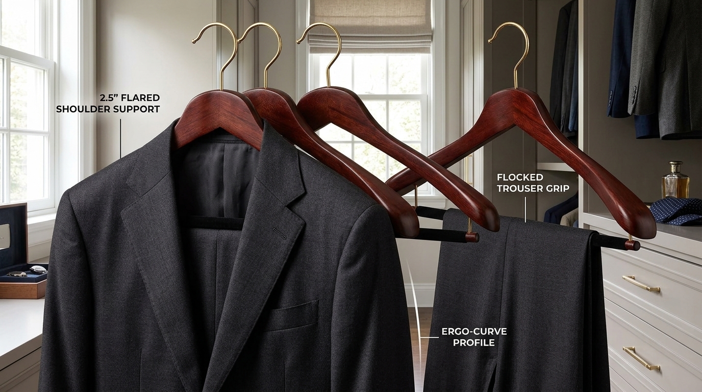 Structural Load: Unlike plastic anti-theft hangers that flex under the weight of a heavy winter coat (common for international travelers), our wooden frames provide a rigid, unyielding support system. This prevents the “Shoulder Sag” that can ruin a guest’s expensive blazer during their stay.